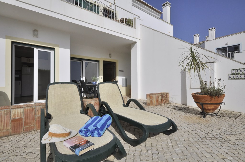 Both terraces feature outdoor dining furniture and deckchairs — ideal for al fresco meals after a day at Burgau beach.