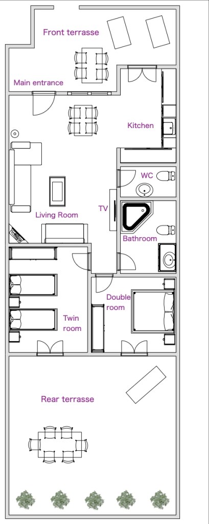 - 1 twin bedroom (2 x 90 cm beds, fitted wardrobes, direct access to rear terrace)